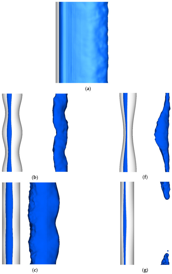 Figure 6 shows the 3D vortical structures as visualized through the utilization of the methodology proposed by Zhou et al. [31]. Apart from the types of undulation, a smooth cylinder is also included as (a) CY in Figure 6 for comparison. The vortical structures are identified by the negative of , which is the second largest eigenvalue of , where and are the strain-rate and rotation-rate tensors, respectively. To analyze the impact of flow structures on the thermal field, temperature contours were overlaid onto the vortical structures.