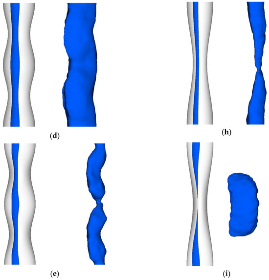 In Case 2, the undulated cylinders form isotherm patterns opposite to those of the corresponding undulated cylinders in Case 1. Thus, the SU, IPU and APU cylinders form denser and coarser isotherms near the saddles and nodes in the x-z and x-y planes, as shown in Figure 11f,h,i, respectively. Successively, the TU cylinder forms denser and coarser isotherms near the nodes and saddles, respectively, as shown in Figure 11g.