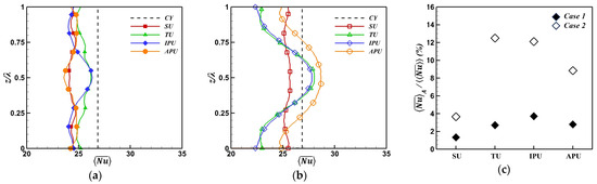 Figure 9a,b present the time- and spanwise local surface-averaged Nusselt number (along the spanwise direction for the undulated cylinders in Case 1 and Case 2, respectively. In addition, the ratios of the amplitude of to ) for the undulated cylinders are shown in Figure 9c, where the amplitude of is defined as . The for the smooth cylinder remains consistent along the spanwise direction due to the statistically homogeneous condition imposed by its two-dimensional geometry.