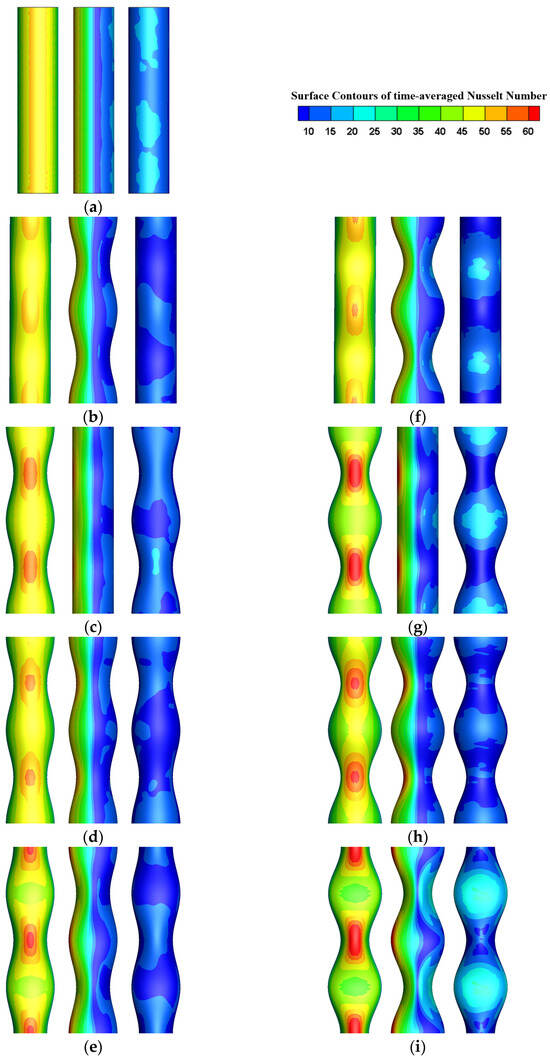Particularly, the APU cylinder in Case 2 causes a much wider region with a very thin isothermal boundary layer compared to the other undulated cylinders, which results in a wider region containing locally large values of on the real surface, as shown in Figure 10i. As a result, the values of the APU cylinder become much larger through the wide region surrounding the saddle than those of the smooth cylinder, as already depicted in Figure 9b showing the spanwise variation in the local surface-averaged Nusselt number.