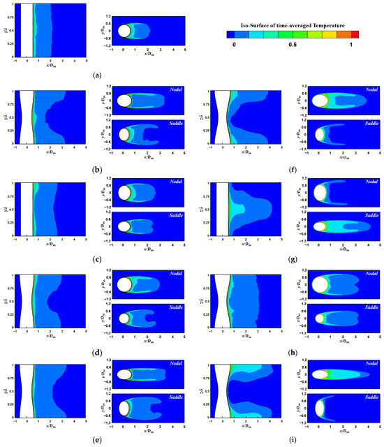 To identify the downstream and rear distributions of observed in Figure 10, the mean isotherms in the x-z plane at y = 0.0 and in the x-y plane at the nodes and saddles for the four different undulated cylinders are presented in Figure 11. In addition to the various undulated cylinders, a smooth cylinder is also featured as (a) CY in Figure 9 to serve as a basis for comparison. In general, the undulated cylinders in Case 1, as shown in Figure 11b–e, form a weaker spanwise-dependent thermal boundary layer than those in Case 2, as shown in Figure 11f–i.