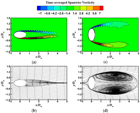In addition, the TU cylinder has the smallest zero-vorticity area, but the APU cylinder presents the largest area of zero vorticity, as shown in Figure 6c,e, respectively, which also support the smallest and largest reduction rates of force coefficients of the TU and APU cylinders seen in Figure 5a,c.