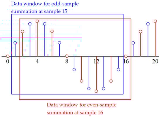 Data windows for odd- and even-sample summations at sample 15 and sample 16, respectively (N = 16).