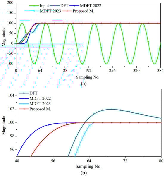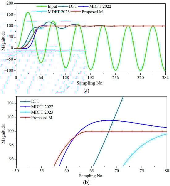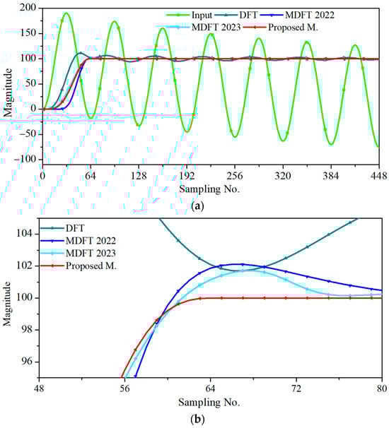 Figure 4 shows the phasor estimation of the input signal containing the time constant of the half cycle generated from (28). The conventional DFT yielded larger errors than the other methods. Figure 4b shows that MDFT 2022 and MDFT 2023 could not converge at sample N + 1, but the proposed method converged after sample N. Assuming an accuracy requirement of ±1%, the new proposed method was more promising in terms of convergence speed and accuracy.
