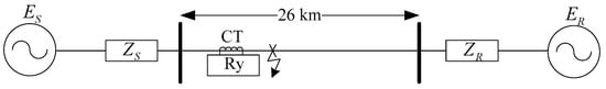 The performance of the proposed method was evaluated for phase a-to-ground faults (a–g faults) on a 154 kV 26 km overhead transmission line as illustrated in Figure 6. and represent the voltage and impedance of the sending end, while and represent the voltage and impedance of the receiving end. The magnitudes of ER and ES were 154 kV with phase angles of 20° and 5°, respectively. is 0.1921 + j2.0538 [Ω], and is 0.5478 + j3.7187 [Ω]. A current transformer (CT) was used to measure the fault current seen by the source. The line parameters are provided in Table 1. Line resistance, line inductance, and line capacitance are denoted as , , and , respectively, while subscripts 1 and 2 indicate positive and negative sequence. Zero-sequence line parameters such as resistance, inductance, and capacitance are denoted as , , and , respectively. PSCAD/EMTDC was used to generate fault current signals in different fault distances varying from 5 to 13 km and fault inception angles were covered from 0 to 90°.The sampling frequency was set to 3840 Hz (64 samples per cycle in 60 Hz systems).