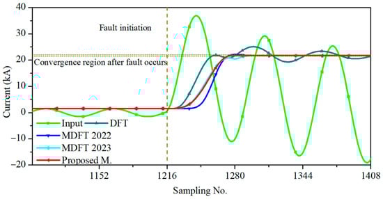 Figure 7 shows the phasor estimation of an a–g fault current at a distance of 5 km from the sending end source and inception angle of 0°. The proposed method was compared with other methods based on the convergence region within ±1%. The conventional DFT exhibited fluctuations for several cycles until DDCO disappeared. MDFT 2022 and MDFT 2023 failed to reach the convergence region before sample N. The proposed method showed a faster response than the conventional method and MDFT methods, as it settled in the convergence region earlier than sample N.