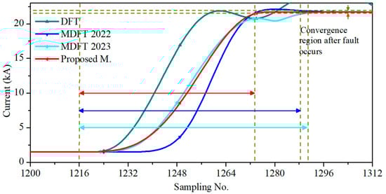 The convergence time served as an evaluation index; this is the time required for the estimated amplitude to remain within 1% of the actual value from the fault initiation. Figure 8 shows the convergence time of MDFT 2022, MDFT 2023, and the new proposed method in milliseconds. It is apparent that the convergence time of the proposed method reached the steady-state region quicker than MDFT 2022 and MDFT 2023.