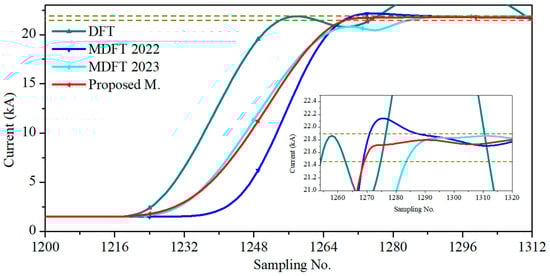 Assuming the system frequency to be constant, the source frequency in the simulations was changed from 60 to 60.2 Hz to consider off-nominal frequency operation. Figure 9 shows the phasor estimation of an a-g fault current at a distance of 5 km and fault inception angle of 0°. The proposed method, MDFT 2022, and MDFT 2023 all adequately managed off-nominal frequency operation; the phasors were accurately estimated. The proposed method converged at 14.06 ms; MDFT 2022 and MDFT 2023 converged at 18.75 ms and 17.70 ms, respectively. The maximum error of the proposed method was 0.62% after sample N from fault inception.