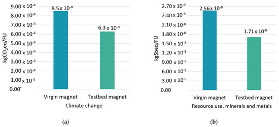 Figure 5 and Table 6 show the environmental impacts of the six most relevant impact categories identified through the process of normalization and weighting of the EF method. Listing the categories in descending order of impact, the ones that constitute at least 80% of the total score were considered. According to Figure 5, the testbed magnet performs significantly better than the virgin magnet in the majority of the most relevant impact categories, namely climate change, use of mineral and metal resources, freshwater ecotoxicity, and marine eutrophication.