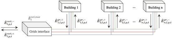 Energy and mass balances as well as heat cascade are the main constraints of the model. Equation (8a) shows the building energy balance between energy flows of the units , the domestic electricity demand and the buildings import and export . A second energy balance is applied at the district scale (3a), allowing synergies between buildings and between energy carriers. The energy balance is closed by energy exchanges with the network outside the community . Technical constraints are considered to model conversion units and to account for infrastructure specifications. For example, Constraint (3b) is applied to restrict the power exchanged on the LV/MV transformer to a specified value . To reduce computational burdens, time series are clustered into typical and extreme operating periods. The typical day frequency is , and the timesteps duration is . The model considers five main sets: buildings B, layers of energy carriers L, typical periods P, timesteps T of each typical period, and units U. More details on the formulation are given in the two following theses [6,8].