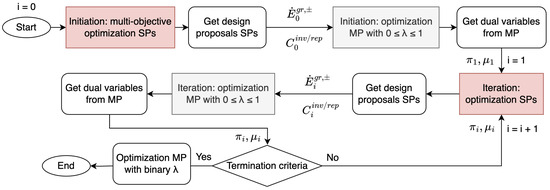 Evaluating simultaneously investment and operation decisions at the building and district scales is computationally intensive due to the network structure of the problem. As described by Middelhauve et al. [23], the CPU time is around a few minutes for a problem with four buildings, whereas it reaches more than an hour with nine buildings. Therefore, the Dantzig–Wolfe decomposition is applied on the original MILP problem. The choice of this decomposition method is linked to the presence of the linking constraints (3), which are at the origin of the problem network structure. The algorithm has been described step by step by Middelhauve et al. [23]. Each building energy system represents a subsystem independent from other subsystems except for the resources balance at the district level (3a) and capacity constraints (3b), being linking constraints. The model is decomposed into two problems: a master problem (MP) and sub problems (SPs). The SPs represent the subsystems and contain building energy and mass balances, as well as investments in building-scale units. The MP considers linking constraints and represents the district energy system problem. Figure 2 describes the decomposition algorithm. First, the SPs are solved individually. The aim of the initiation is to obtain a set of system configurations representative of the SPs solution space. Each configuration accounts for an investment into conversion units and associated energy flows with the district grids . A multi-objective optimization between CAPEX and OPEX is performed to obtain seven system configurations for each building. With this initial set of SPs configurations, the MP is initiated. The latter selects an optimal set of SPs configurations by a linear combination of the proposals. A weight is attributed to each SPs design proposal. In the initiation and iteration loop, an LP relaxation is performed, and the MP is optimized with continuous . Once optimized, the MP calculates the dual values of the linking constraints that are inserted in the SPs objective function as Lagrangian multipliers. While the latter provide SPs with information on the state of the district energy system, the SPs attempt to react to this signal with new design proposals. The SPs are formulated as reduced costs, meaning that a solution with a negative value has the potential to improve the MP objective. The iteration loop terminates when the SPs cannot find negative reduced costs or when the maximum number of iterations is reached. The solution obtained represents a lower bound due to the LP relaxation. Therefore, a last MP optimization is performed with binary weights to ensure integrality of the SPs binary variables. This optimization provides an upper bound to the objective function. The resulting gap between the two bounds is typically below 0.1% [23]. This value is considered sufficiently low, and the algorithm is terminated.