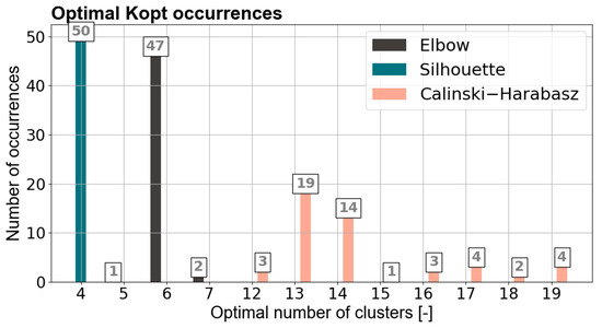 The k-medoids algorithm is run over 50 iterations to estimate the optimal number of clusters . The latter corresponds to the minimum number of clusters required to represent the initial dataset as faithfully as possible. Three indicators are used to assess the clustering quality: elbow, silhouette and Calinski–Harabasz (CH). The silhouette and CH indexes are two metrics of the clusters cohesion [26]. Therefore, the aim is to maximize their score. In contrast, the elbow method measures the distortion of the clusters and should be minimized. Figure 3 presents the mean score of the indicators. The trade-off between information loss and complexity reduction is clear for the CH and elbow index. Below 10 clusters, the marginal performance improvement of adding a new cluster is high. The value of is, respectively, 6 and 7 for the elbow and CH index. Regarding the silhouette index, reaches 4 clusters but the metric does not capture well the trade-off between information loss and complexity. While Figure 3 shows the mean score of the metrics over all iterations, Figure 4 represents the distribution of . The silhouette and elbow score are robust. However, the result of the CH metric is distributed over several , ranging from 12 to 19 clusters. Since is measured at the maximum of the CH score and since this maximum is located on a plateau, it makes difficult to locate. Therefore, the mean score interpretation is preferred. Based on this analysis, the optimal number of clusters is between 6 and 10. The exact value of depends on the level of detail needed for the case studies to accurately represent specific regions. This clustering algorithm allows considering versatile district typologies within a restricted set of case studies. In particular, it allows the contextualization and extrapolation of local decisions to the national scale.