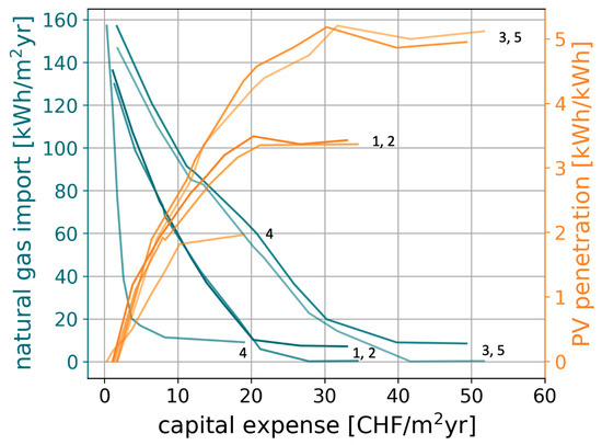 A multi-objective optimization between the CAPEX and OPEX is performed to obtain the solution trends for each district. Figure 7 shows the progressive substitution of the principal energy source, natural gas, by renewable energy as investments are increased. Gas boilers deployment corresponds to the solution with lowest investment and highest operational cost. Then, it is substituted by investments into heat pumps and solar panels. The marginal PVP improvement decreases with investment since the best roof orientations are activated first. The typical districts split into three decision-making trends. This behavior is mainly explained by the ratio between roof surfaces and heated surfaces. This ratio can be considered as an approximation of the PVP. With its large farms, the Forest cluster (4) has the largest solar potential. However, it has as well the highest heated surface among the typical districts resulting in the lowest ratio ( = 0.57) and therefore the lowest PVP. The Urban (1) and Sub-urban (2) districts have similar building compactness ( = 0.80 and 0.86), even though they contain different building density and usage purposes. Finally, since clusters 3 and 5 mainly contain single-family dwellings, they have the largest roof area with respect to their energy demand ( = 1.26 and 1.42). Since a large ratio usually represents small buildings, it means as well a low economy of scale. As there is a fixed investment cost to install energy units, the investment to decarbonize the energy system increases together with .