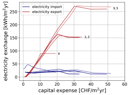 Besides decarbonization, local investment decisions have as well an impact at the districts boundary. Figure 8 presents the annual electricity flows at the LV/MV transformers. Electricity imports remain more or less constant with the investment since the installation of PV panels compensates for the electricity consumption of heat pumps. In District 4, heat pumps are deployed before PV panels, resulting in an increase in electricity imports in the low-investment region. Electricity exports follow the same trend as the PVP, with the difference of exhibiting a constant slope of 9.4 kWh/CHF, a value to be put in perspective with the feed-in tariff promoting a sale of 10 kWh/CHF. It demonstrates the sensitivity of investments and energy flows to energy tariffs. Besides maximizing self-consumption, energy communities are able to move from passive consumers to renewable electricity suppliers. And this shift in role is predetermined based on the price signals. A question still remains: do the grid operators provide the right incentives to perform the energy transition?