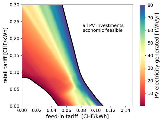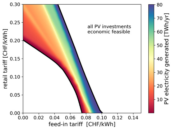 As seen in Figure 7, the marginal cost of PV panels is increasing with the investment allocated. The last economically feasible point is obtained once the investments into PV panels break even with the revenues over their lifetime [6]. Since the revenues vary with the electricity tariffs, the investments induced by the tariffs can be calculated assuming that local stakeholders would invest until they reach the last economically feasible point. Figure 9 and Figure 10 present these induced investments in the form of annual renewable electricity generated by energy communities in Switzerland for a range of feed-in and retail tariffs. Figure 9 is generated assuming that the investments were optimized for each building individually while Figure 10 represents the case of energy communities. Below a certain energy tariff, PV investments are not profitable due to the affordable electricity cost from the grid. The investment threshold is delimited by the lower black line. On the other side, the upper investment limit maps the region where the PV installed capacity reaches its maximum of 67.2 GW, representing an annual electricity generation of 80 TWh/yr. The extrapolation to the national scale assumes that 70% of the roofs are suitable for PV installations [32]. The PV potential calculated in this study is 14% higher than the one estimated by Swissolar (70 TWh/yr [32]). Since the PVP varies within and throughout typical districts, there exists a large spectrum of investments. Districts with high solar potential are firstly selected. Then investments with lower profitability are allocated as the price signals sent by the grid operators become more attractive. Present energy tariffs incite to invest into the maximum PV panels capacity, reaching a potential of 80 TWh/yr. However, Schnidrig et al. estimated that the cost-optimal PV deployment in Switzerland would lead to a 20 TWh/yr electricity generation from PV panels [3]. This optimum considers the possibility of energy storage in hydro dams, batteries, and biogas or hydrogen reservoirs. In addition, it accounts for grid availability, power losses and peak power. Based on this value, the price incentives should fall within the red–orange region. In conclusion, there is a discordance between the price signals sent by grid operators and the long-term needs of the infrastructure. This situation could result into costly grid reinforcements or local PV generation curtailment. In both cases, the solution is socially unfair since the former induces costs to end users and the latter might render some investments unprofitable. In the remaining of the analysis, the impact of curtailment is analyzed in terms of energy efficiency and costs.