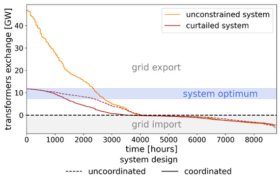 To support the analysis, two scenarios are considered. In the first one (uncoordinated), an investment decision into PV panels and heat pumps is taken today. Then, peak shaving is applied on the energy system. The investment into storage units and their operation are optimized with fixed sizes of PV and heat pump units. In the second scenario (coordinated), all investment and operation decisions are taken considering peak shaving. Therefore, PV and heat pump capacities vary as the system is being constrained. The aim of these two scenarios is to assess the impact of peak shaving on the decision-making and to measure the importance of coordinating investments. Figure 11 shows the load duration curve of electricity flows between energy communities and the national grid. The present electricity tariffs promote a peak export power of 46.8 GW, exceeding by a factor of three the existing capacity of the Swiss MV grid, being 15.8 GW [3]. The optimal PV capacity is represented in Figure 11 by the blue area and corresponds to a peak PV power of 15.4 ± 2 GW with a self-consumption of 5.8 GW at the time of the peak export. The curtailed system reduces by two thirds the maximum export power. The uncoordinated scenario exports more electricity and has a flat profile. Because of its large PV capacity, the energy system simply curtails the exceeding power. This outcome is beneficial for the grid operators since the export profile shows fewer variations. However, from the perspective of households, the PV investment is oversized since the optimal export profile would have been 29% lower (plain red line).
