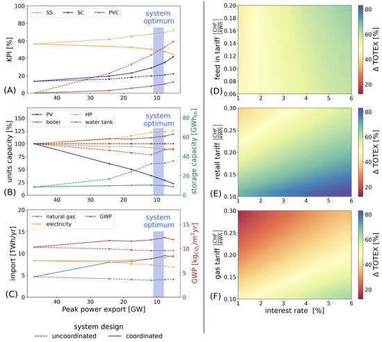(A) Energy performance, (B) energy units capacity and (C) energy imports and GWP with respect to peak shaving. All values are given after extrapolation to the whole country. The GWP is normalized per heated surfaces and considers the embodied emissions and emissions of purchasing energy carriers. (D–F) present the total cost differences between the two system designs at the peak shaving optimum for a range of energy tariffs and interest rates.