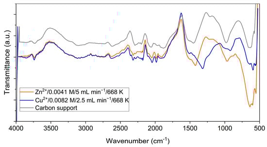 Figure 2 shows the FTIR spectra of the ZnO/C and CuO/C type composite materials obtained at 668 K and, for comparison, the spectrum of the initial carbon support. The three spectra were similar at wave numbers of up to 1200 cm−1. The spectral bands observed in the region of 3600–3100 cm−1 were attributed to the O-H bonds in the water molecule. Also, the OH groups were confirmed by discrete absorption bands around 1387–1405 cm−1 [30]. The bands in the 2600–1900 cm−1 region correspond to the C=C stretching vibrations of numerous sp2 structures that enrich the carbon structure [31]. The presence of C=O bonds was indicated by the spectral bands in the 1500–1400 cm−1 range. The bands specific to metal–oxygen bonds were observed in the fingerprint region between 1200 and 700 cm−1 [32]. Moreover, the characteristic bands of the Cu-O bonds were observed in the region of 550–600 cm−1 [33,34].