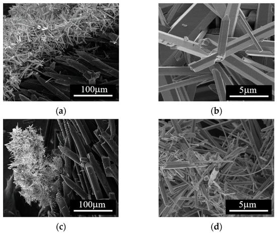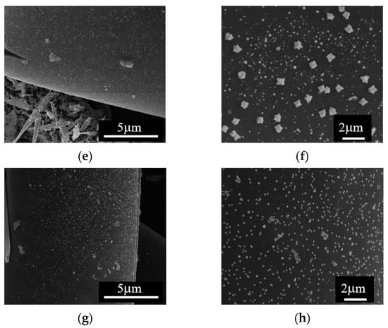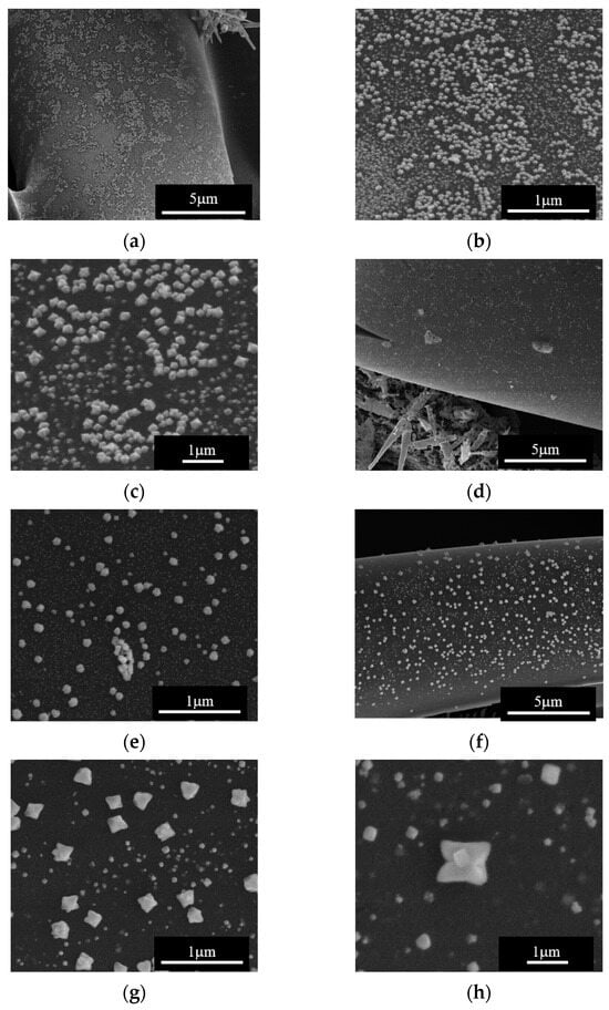 The effect of the flow rate on the impregnation procedure is more evident in the SEM analysis of ZnO/C composite materials presented in Figure 6. There were 1D particles attached to the carbon fibers at both flow rates (Figure 6a,b,e,f); however, at a low flow rate, the surface of the carbon fibers was covered by hexagonal-shaped nanoparticles of different sizes (Figure 6c,d), whereas at a higher flow rate, there were carbon fibers homogeneously covered with MexOy crystalline cuboid-shaped nanoparticles of about 60 nm in size (Figure 6g,h).