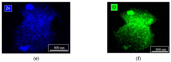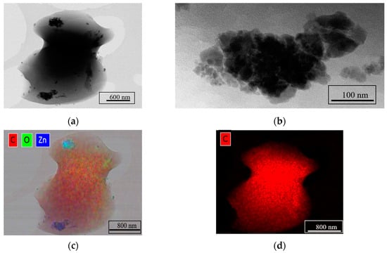 Figure 4 shows the results of TEM characterization and chemical composition analysis by EDS for the ZnO/C type material obtained at 668 K, with a 5 mL min−1 flow rate and 0.0041 M zinc concentration in the precursor solution. The TEM images (Figure 4a,b) reveal the formation of small crystalline particles of approx. 50 nm in size, and the EDS maps presented in Figure 4c–f confirm that these nanoparticles are ZnO on C support.