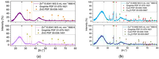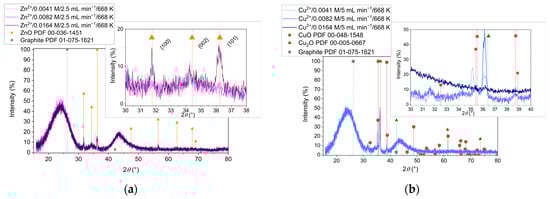 Figure 5 presents the XRD analysis of the samples obtained from Zn2+ (Figure 5a) and Cu2+ (Figure 5b) precursors with two different flow rates of the reactant mixture during impregnation (2.5 mL min−1 and 5mL min−1, respectively). It should be noted that increasing the flow rate allowed the formation of more crystalline ZnO (Figure 5a) and the formation of CuO (Figure 5b). At a low flow rate instead, Cu2O was predominately formed, indicating the influence of the redox environment related to the higher rate of mixing.