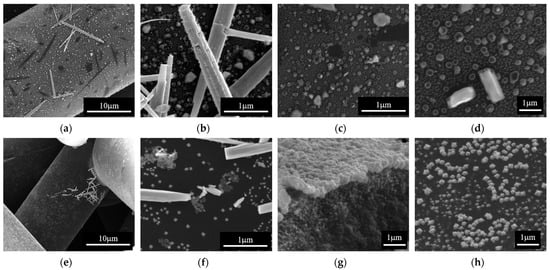 SEM images of samples obtained at different concentrations of Zn2+ in the precursor solution: (a–c) for Zn2+/0.0041 M/5 mL min−1/668 K; (d,e) for Zn2+/0.0082 M/5 mL min−1/668 K; (f–h) for Zn2+/0.0164 M/5 mL min−1/668 K.