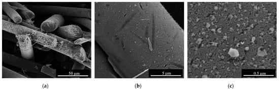 The SEM analysis of the sample obtained at 668 K with a low Cu2+ concentration and low flow rate of the precursor solution showed the formation of large 1D particles together with nanoparticles uniformly covering large areas of the carbon surface. Figure 9 presents this result and shows the morphological details at different magnifications of the copper oxide nanoparticles formed under the above-mentioned conditions.