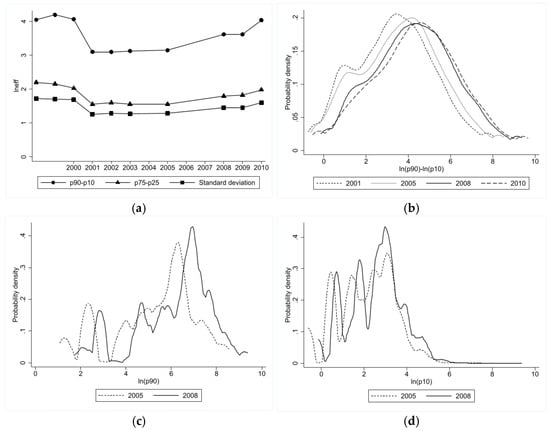 This study examined the carbon emissions efficiency of different enterprises within subdivided industries, drawing on the approaches of Syverson [37] and Hsieh and Klenow [38]. As a first step, the enterprises were subdivided into 320 subsectors based on the four-digit codes of the national economy, of which 104 were classified as high-energy consumption industries. This classification provided a reference for measuring the degree of difference in other variables among firms within subdivided industries. Following this, we obtained the distribution function of the natural logarithm of the efficiency of reducing carbon emissions of companies within each subdivided industry. To quantify the heterogeneity of TPI within each subdivided industry, the differences between the 90th and 10th percentiles, the 75th and 25th percentiles, as well as the standard deviation within each subdivided industry, were calculated. The 320 subdivided industries exhibited considerable heterogeneity in the efficiency of carbon emissions. For example, when using the same amount of energy, a company at the 90th percentile of the industry TPI distribution can increase its industrial output by 53.9 times compared to a company at the 10th percentile (see Figure 1a).