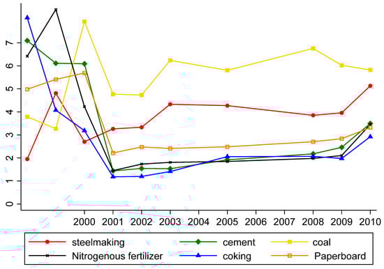 This paper compares enterprise-level TPI differences and analyzes the factors influencing them using data from China’s Polluting Enterprises (2001–2010) and China Industrial Enterprises (2001–2009), matching these datasets. According to the China Polluting Enterprises data, 85% of China’s major pollutants originate from enterprises that produce industrial output, consume energy, and emit pollution. The monitoring system included 219,810 industrial enterprises between 2001 and 2010. Environmental protection departments compile these data based on self-reporting by polluting enterprises, with local environmental protection departments conducting irregular inspections at the county level to ensure data accuracy. These environmental microeconomic data are regarded as the most comprehensive and reliable in China [32]. Since 2006, pollution emissions from the thermal power industry have been excluded from environmental monitoring statistics due to changes in the environmental statistics reporting system during the “11th Five-Year Plan” period. To ensure data consistency and continuity, all sample firms in the fields of electricity, heat production, and supply were excluded from the analysis. Additionally, following the sequential matching method proposed by Brand et al. [33], and drawing upon the practices of Cai and Liu [34] and Feenstra et al. [35], value-added data and financial information for the sample enterprises were obtained. The first step involves processing the industrial and pollution discharge databases according to Brandt [33]. The second step matches the data according to the enterprise name and year with the pollution discharge database. The third step uses the organization code and year for matching. The fourth step merges the matched data from the second and third steps, removing duplicates. Finally, the industrial enterprise database after matching is obtained. For industrial output, enterprise sales, and fixed assets, extreme values within the top and bottom 5% quantiles were excluded from the analysis. Overall, the sample matched 58% of enterprises with industrial outputs greater than 10 million yuan, achieving a matching rate of 69% for enterprises with higher outputs.