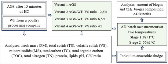 The experimental work was carried out under laboratory conditions in batch fermentation reactors. The study was divided into two stages (S). The criterion for the separation of the stages was the temperature of AD. In stage 1 (S1), the process was carried out under mesophilic conditions (38 ± 1 °C), and in stage 2 (S2), under thermophilic conditions (55 ± 1 °C). Four variants (V) were distinguished in each stage. Depending on V, a different proportion of volatile solids from the WF was used in the substrate mixture. In variant 1 (V1), no WF was added to the AGS pre-treated in the HC process (control sample). In variant 2 (V2), the proportion of volatile solids from WF was 8%, in variant 3 (V3) 15% and in variant 4 (V4) 25%. The organigram of the experiment is shown in Figure 1.