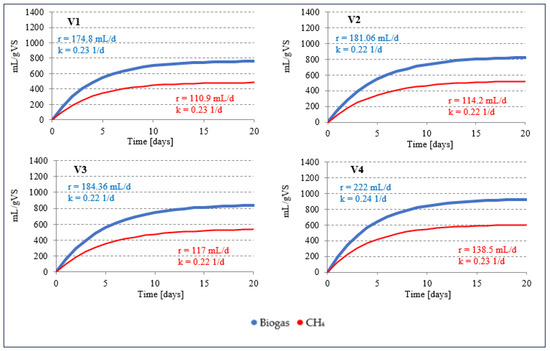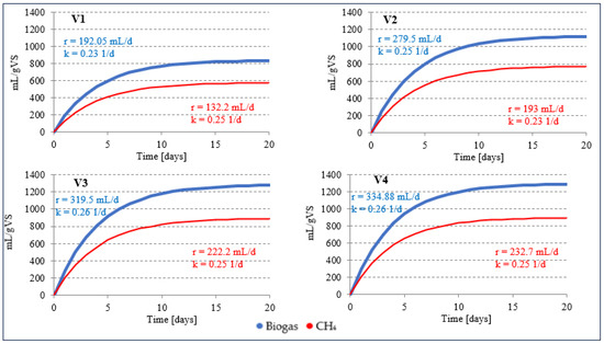 The biogas and CH4 production rate (r) and the rate constants (k) were estimated on the basis of an iterative method with linear regression [26].