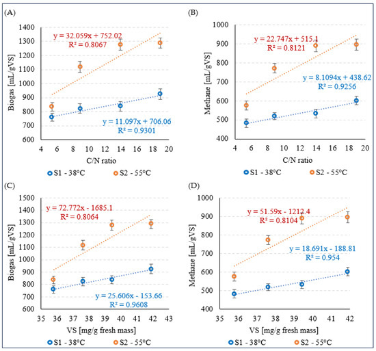 The increase in biogas and CH4 production for the variants V1–V4 during mesophilic fermentation in S1 was strongly positively correlated with the C/N ratio, and the coefficients of determination were R2 = 0.9301 (Figure 5A) and R2 = 0.9256 (Figure 5B), respectively. A strong positive correlation between these parameters was also observed in S2, as evidenced by the coefficients of determination of R2 = 0.8067 for biogas (Figure 5A) and R2 = 0.8121 for CH4 (Figure 5B). Similar relationships were observed between VS concentration and biogas and CH4 production, with very strong positive correlations in S1 (Figure 5C) and strong positive correlations in S2 (Figure 5D).