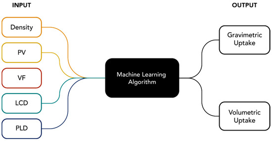 Using the data gathered, 13 machine learning methods with preset hyperparameters using MATLAB 2021b Regression Learner were tested. Five input variables were used in predicting the gravimetric uptake (UG) and volumetric uptake (UV) of hydrogen in 29,608 MOF structures. The schematic diagram of the prediction using different machine learning models is given in Figure 1.