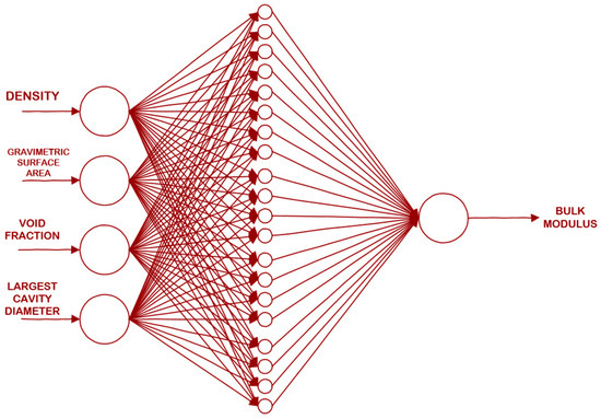 The bulk modulus was predicted using an artificial neural network that used four input variables, as enumerated in Table 4. The schematic diagram for the prediction is given in Figure 2.