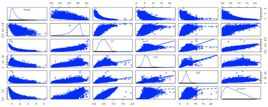 The gravimetric and volumetric uptakes at the PS in the dataset used in the machine learning modeling are represented with respect to the input variables using scatter plot matrices, as shown in Figure 3 and Figure 4. The scatter plot matrices were generated using R Studio.