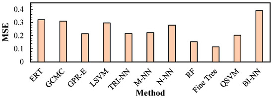 Figure 5 shows a graphical representation of the MSE values calculated for the simulated GCMC data and ML predictions relative to the experimental UG values denoted in Table 6. The top-performing algorithm was found to be the fine tree DT variant, with an average MSE of 0.1105. To first address the discrepancy between the GCMC and predicted values, this is carried over from Ahmed and Siegel’s study [9], wherein inaccuracies in the MOF crystal structure data were cited as possible points for errors in the GCMC simulations, which directly contributed to the disagreement between the predicted and GCMC values. The remarkable results shown by the fine tree relative to the experimental values, despite the training conducted with the GCMC simulated values, are considerable and suggest that the model fit compensates for the errors incurred in the GCMC simulation.