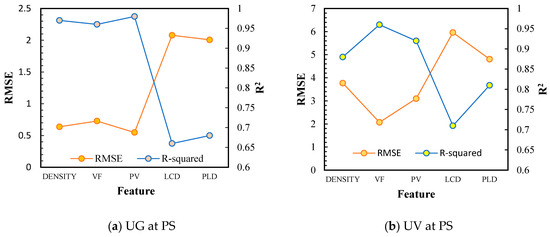 Based on Figure 6, it can be seen that the void fraction and pore volume are the two most important features that can effectively predict the MOFs’ H2 adsorptive capacity. For UG, the most crucial feature was PV, followed by density and VF. On the other hand, VF was followed by PV in terms of importance for UV. These results mirror the results reported by Ahmed and Siegel [9], who credited the significant role of pore volume to the Chahine rule. In his previous study in 2017, Ahmed [31] found that both the PV and the VF are highly correlated with the excess uptake obtained through the Chahine rule. This study by Ahmed further verifies the significance of both descriptors to the prediction.