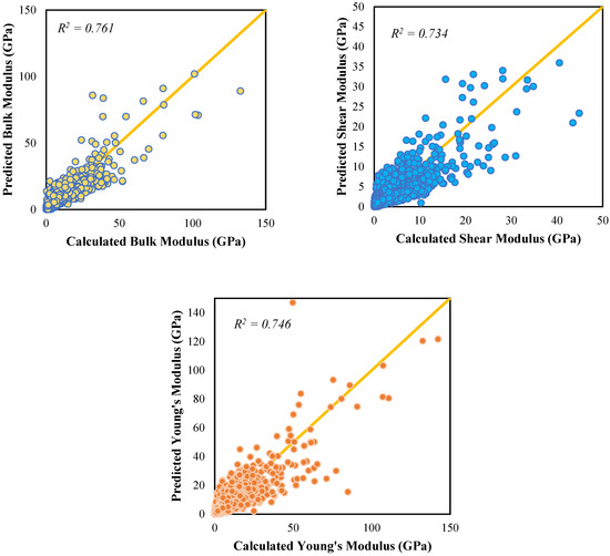 Among the other algorithms, it was also the 4-20-1 ANN that gave the most accurate prediction for the shear and Young’s moduli, respectively. Figure 7 contains the scatter plots for the predicted and calculated moduli. From the graphs, it can be noted that the ANN gave the highest R2 for the bulk modulus, which indicates that among the three moduli, the predicted bulk moduli are quite close to the bulk moduli that were computed using DFT. However, the accuracy for the shear and Young’s moduli is not very far behind.