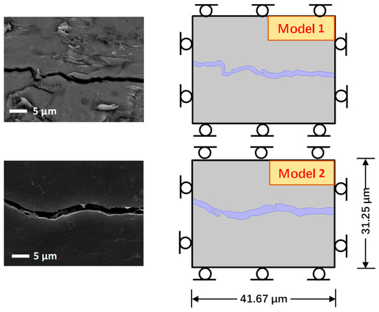 In this paper, there are two research models that selected from the core of Qinshui Basin, the true coal cleat contours of which were obtained using SEM. The SEM images were then manipulated by image recognition technology to achieve the real geometries of the cleats that could be implemented in COMSOL Multiphysics, as shown in Figure 1. This geometric model is the numerical simulation calculation area for the micro-two-phase flow of coal, the size of which is 31.25 μm × 41.67 μm for every model.