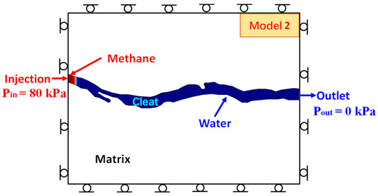 In their initial state, the coal cleats are saturated by the water phase. On the left is the injection port, injecting single-phase methane gas with a pressure of 80 kPa, and on the right is the outlet port with a pressure of 0 kPa, as shown in Figure 2. According to the Young Laplace equation, the displacement pressure is sufficient to overcome the capillary force inside the coal cleat and drive the two-phase flow. In the geometric model, the blue area represents the coal cleat, and outside of the blue area represents the coal matrix.