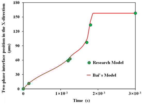 Comparison chart of two-phase interface position along the x-direction at different displacement times for research model and Bai’s model.