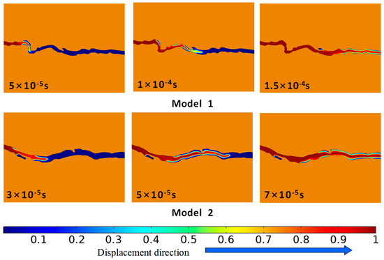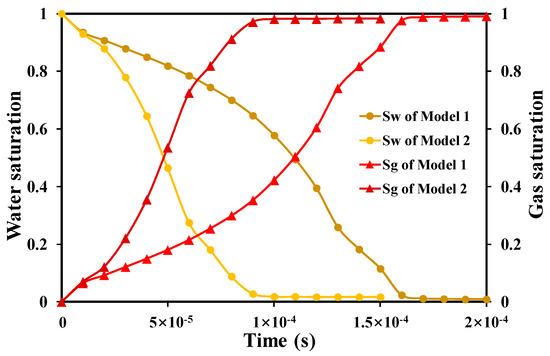 The average openings of the coal cleat of Model 1 and Model 2 are 1.24 µm and 1.84 µm, respectively, indicating that the displacement efficiency of the two models is also different. In Figure 4, the time taken for the gas phase displacement front to reach the outlet is 1.5 × 10−4 s for Model 1, while the gas phase displacement front of Model 2 arrives at 7 × 10−5 s. Compared with Model 2, Model 1 has a smaller average coal cleat opening and a more complex flow path, resulting in lower displacement efficiency. At the same time, both Model 1 and Model 2 have dead end, resulting in the formation water at that location still being difficult to displace and forming bound water until the displacement is completed.