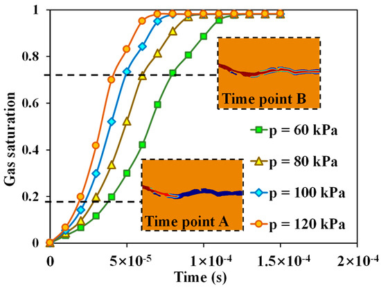 The higher the injection pressure, the better the gas phase can overcome the capillary force and surface tension, and the faster the corresponding gas flow rate. There are two obvious turning points in the gas saturation curve under different injection pressure conditions, located at gas saturation of 18% and 72%, respectively, as shown in Figure 6. When the gas saturation reaches 18%, the gas phase front breaks through the narrow area (Time point A in Figure 6). At this point, the capillary force decreases and the gas flow rate increases. Afterwards, the gas saturation enters a rapid increase stage. When the gas saturation increases to 72%, the gas displacement front reaches the outlet end of the coal cleat (Time point B in Figure 6), and the gas forms continuous flow in the flow section. Until the end of displacement, the gas saturation no longer increases.