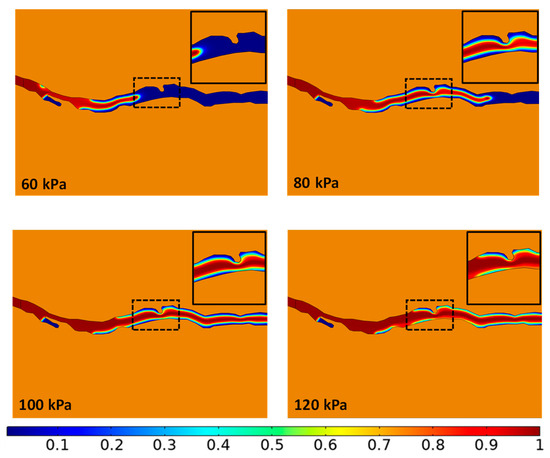 Taking Model 2 as an example, the injection pressures are set to 60 kPa, 80 kPa, 100 kPa, and 120 kPa, respectively, and the simulation time is 1.5 × 10−4 s. In this paper, the influence of injection pressure on the displacement process is analyzed from two aspects: gas phase saturation and fluid flow rate.