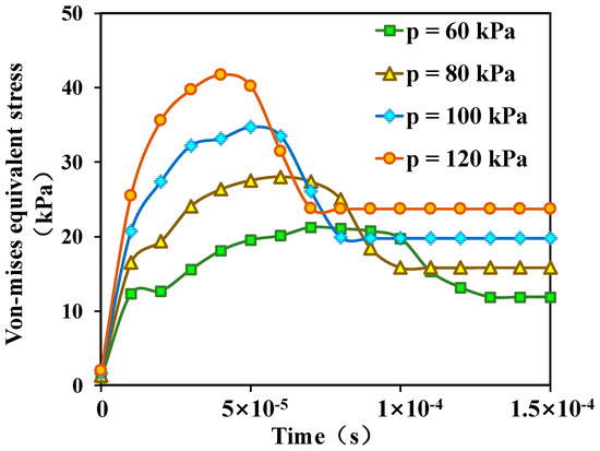Variation curve of the Von-Mises equivalent stress in coal matrix under different injection pressure conditions.