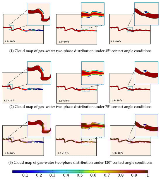 Taking Model 1 as an example, according to the wettability classification criteria [16], the contact angles of the research model were set to 45°, 75°, and 120°, respectively, to simulate the super hydrophilic, slightly water-wet, and gas wetting states.