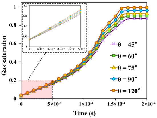 With the increase in the contact angle, the increase rate of gas phase saturation is accelerated, and the displacement efficiency is also continuously improved, as shown in Figure 10. The contact angle increases from 45° to 120°, that is, the model wettability changes from a strong hydrophilic state to a gas wetting state, and the gas phase saturation increases from 0.871 to 0.992 at the end of displacement. At the same time, it can also be observed that in the early stage of displacement, there is a trend of higher gas saturation with a larger contact angle. However, the impact of contact angle on gas saturation is mainly reflected in the middle and later stages of displacement. This is mainly due to the fact that when the displacement pressure difference is enough to overcome the capillary force and viscous force in the coal cleats, the influence of wettability on the displacement efficiency is mainly reflected in the displacement of gas relative to residual water. When the coal rock is in the gas-wetted state, it is conducive to the gas phase displacement of formation water in the fracture, so as to improve the displacement efficiency. It can be seen that the recovery rate of coalbed methane can be improved by changing the wettability state of coal rock.