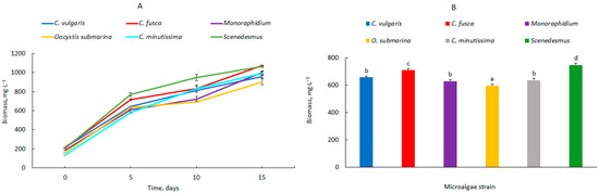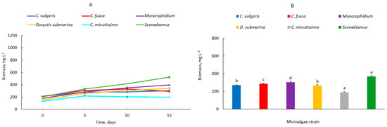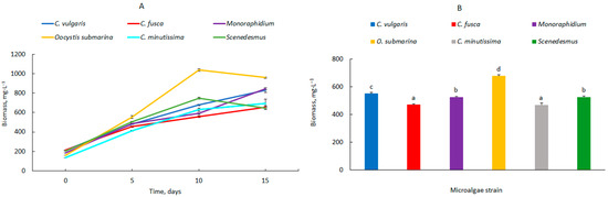 The mean microalgal biomass content, shown in Figure 1B, ranged from 596 ± 10.6 mg·L−1 (O. submarina) to 747 ± 15.4 mg·L−1 (Scenedesmus).