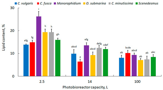 The lipid content of the biomass is shown in Figure 4. The high lipid content of the microalgal biomass determines its potential utilisation in biodiesel production [42]. The highest values were found for cultures cultivated in photobioreactors of 2.5 L capacity. In general, increasing the volume of the photobioreactor decreased the lipid content of the biomass. There was one exception for the C. fusca strain, where the lipid content in the 100 L volume photobioreactor was higher compared to the 14 L capacity, 10.2 ± 1.2% versus 6.4 ± 1.1%, respectively. The decrease in lipids in the biomass of microalgae grown in the 14 L photobioreactor ranged from 25% (Scenedesmus) to 57% (C. fusca). In 100 L photobioreactors, lipid reduction ranged from 32% (C. fusca) to 64% (Monoraphidium). The lower lipid content in higher capacity photobioreactors may be related to the differential transmission of light in the culture medium. According to Amaro et al. [43], the appropriate kind of lighting and light intensity can potentially increase lipid content between 25 and 42%. Also, the shape of the photobioreactor and the method of culture stirring could have a strong influence on the lipid accumulation potential [44,45] In the present study, the highest lipid accumulation rate for the highest photobioreactor capacity was observed for Monoraphidium (10 ± 1.2%). The average amount of lipids for this strain ranged from 5 to 58% [46].