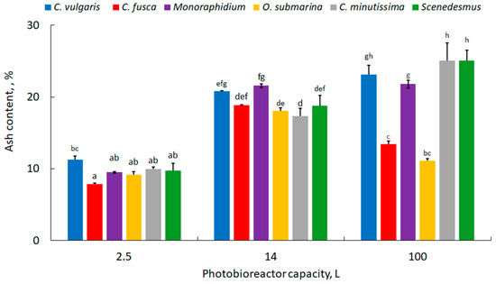 The microalgal biomass ash content is shown in Figure 5. This parameter is important when the biomass is intended as feedstock for biofuel production. An excessive ash content has a negative impact on biofuel properties [67]. In the presented study, the lowest values were recorded for strains grown in 2.5 L photobioreactors and ranged from 7.8 ± 0.2% for C. fusca to 11.3 ± 0.5% for C. vulgaris. When the culture scale was increased to 14 L, there was an increase in ash biomass, with values ranging from 17.3 ± 1.1% for C. minutissima to 21.6 ± 0.3% for Monoraphidium. Metsoviti et al. [68] cultivated C. vulgaris in a 25 L photobioreactor and determined an ash content of approximately 12%. In this study, compared to the 14 litre capacity, the ash content for C. vulgaris, Monoraphidium, C. minutissima, and Scenedesmus increased by 11, 1, 45, and 33%. In the biomass of C. fusca and O. submarina, the ash content decreased slightly to 11.1 ± 0.3 and 13.4 ± 0.4%, respectively. The ash content of the biomass varied depending on the microalgae species and the culture methods and growing conditions [69,70,71]. In our previous studies, the decrease in ash content was associated with a limited nutrient availability [56]. In the present study, the culture medium was used in complete composition at all steps, and a reduction in ash content was noted at the industrial stage for only two microalgae species. However, at the same time, the increase in lipid content that is reported under stress conditions was not observed.